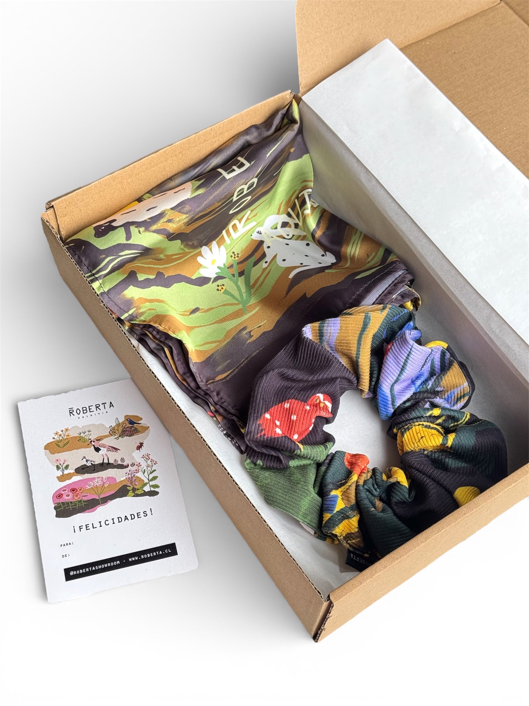 Incluye un pañuelo de 70 x 70 cm y un scrunchie a juego, ambos en nuestro estampado Paisaje Negro.