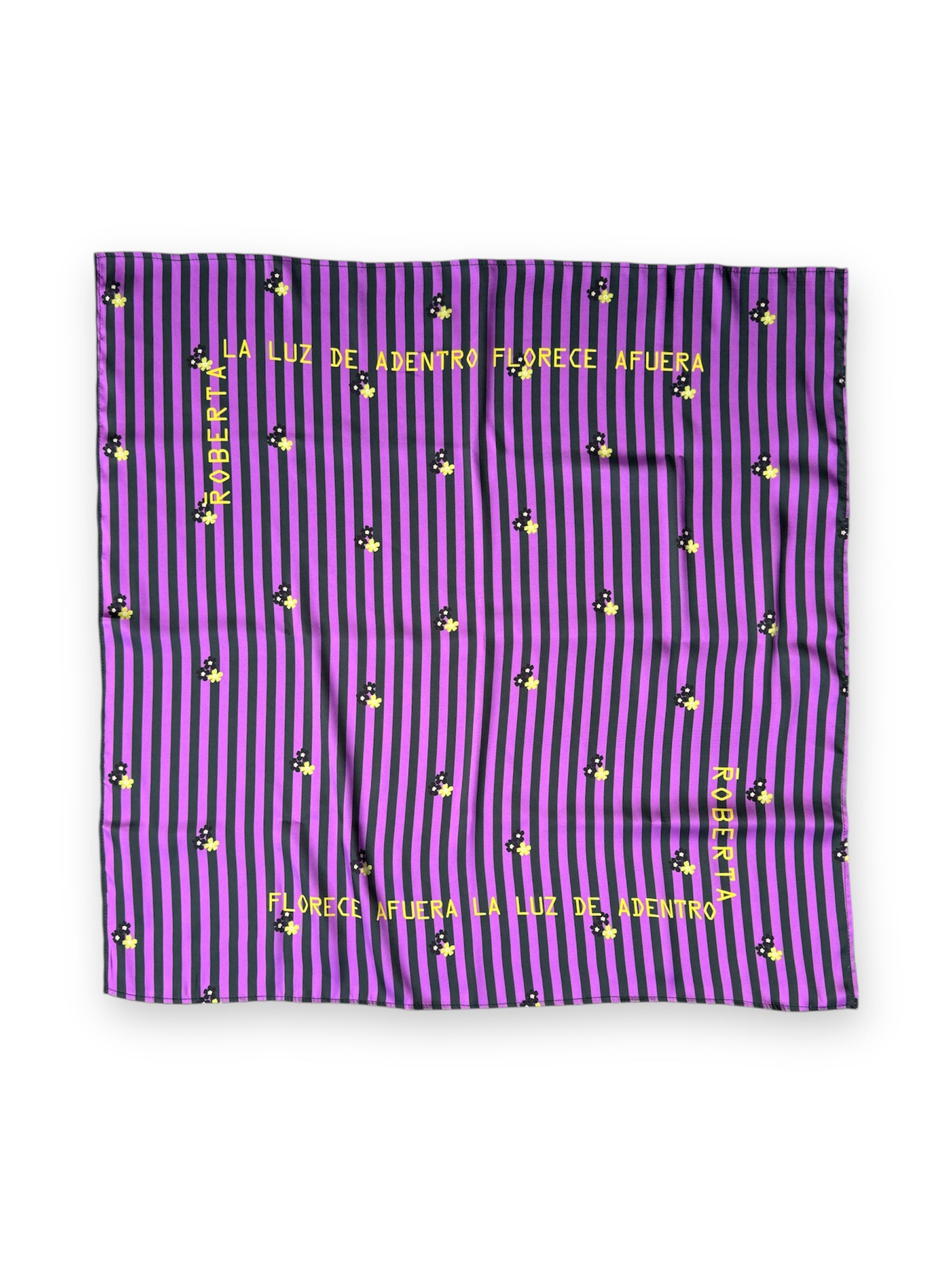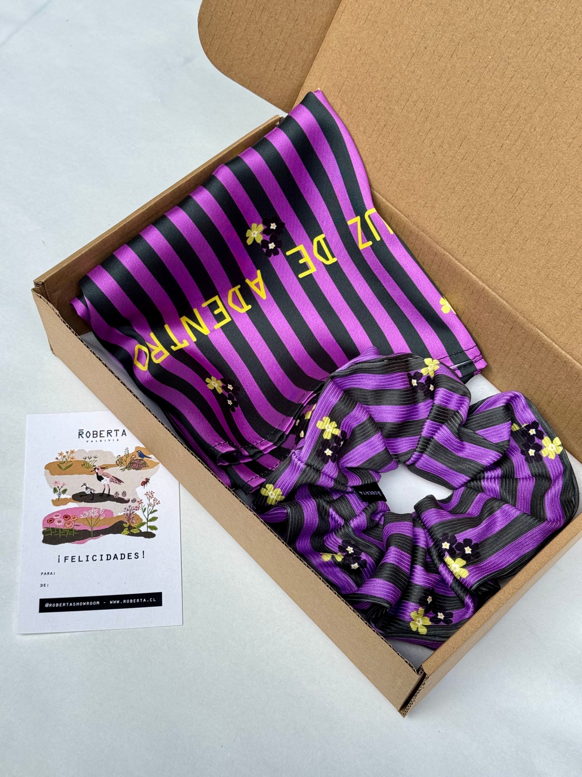 Incluye un pañuelo de 70 x 70 cm y un scrunchie a juego, ambos en nuestro estampado Rayas Flores.