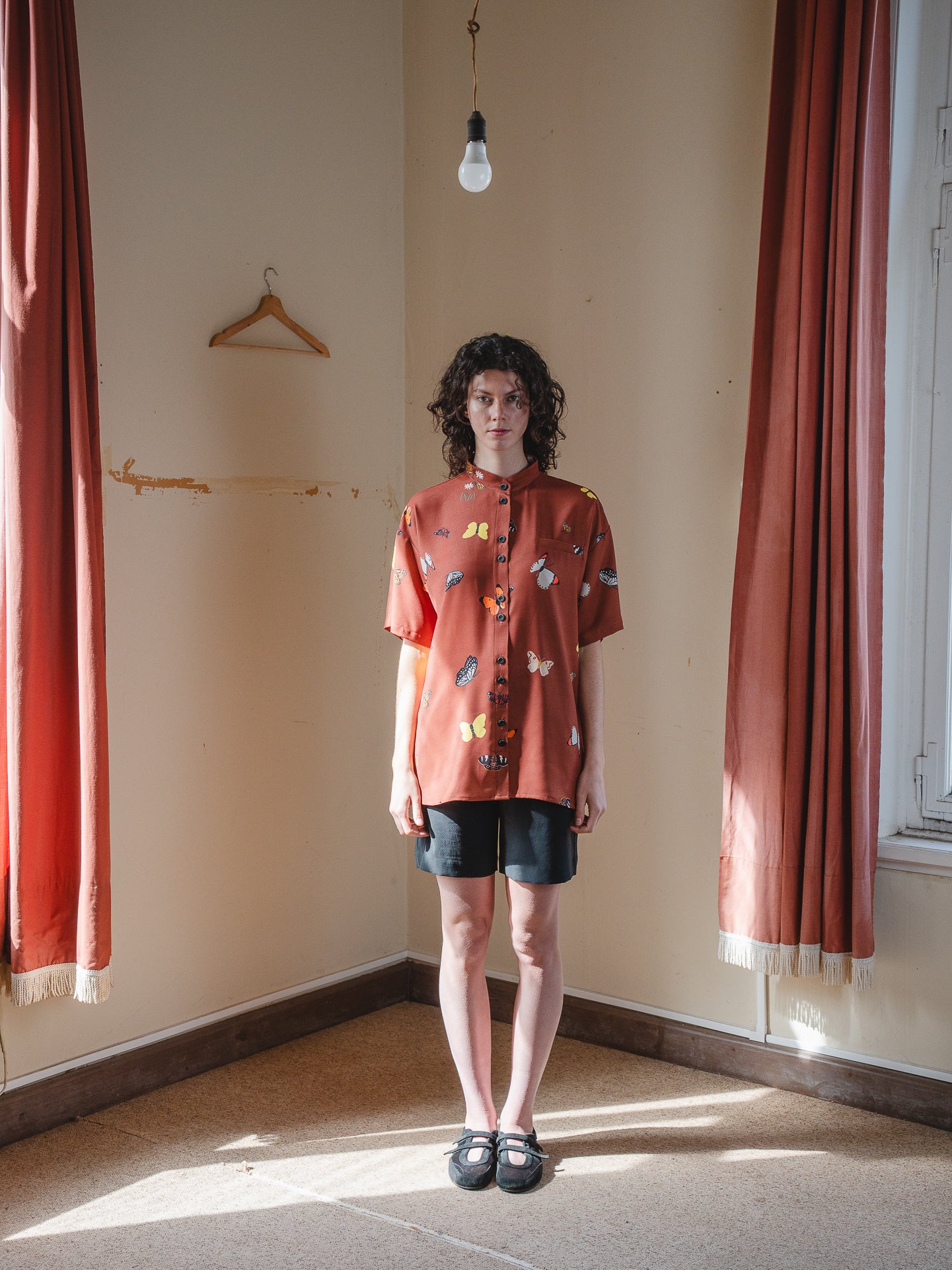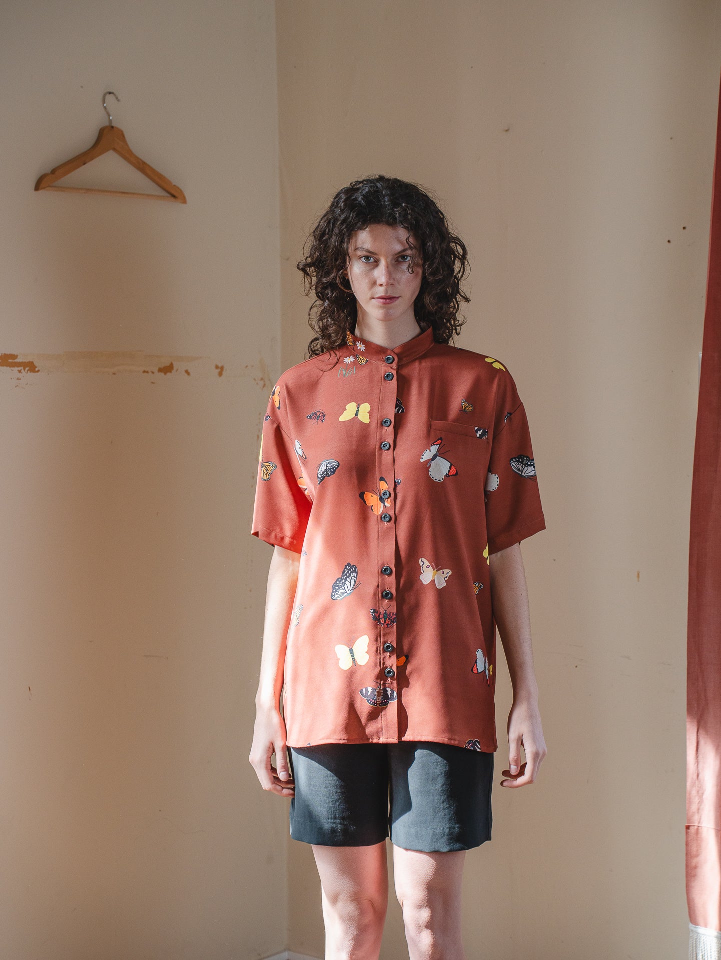 Camisa manga corta, calce relajado tipo oversize. Hombro caído, canesú y pliegue en espalda, muy linda caída. Estampado propio sobre tela 100% Viscosa, estampado propio ROBERTA.