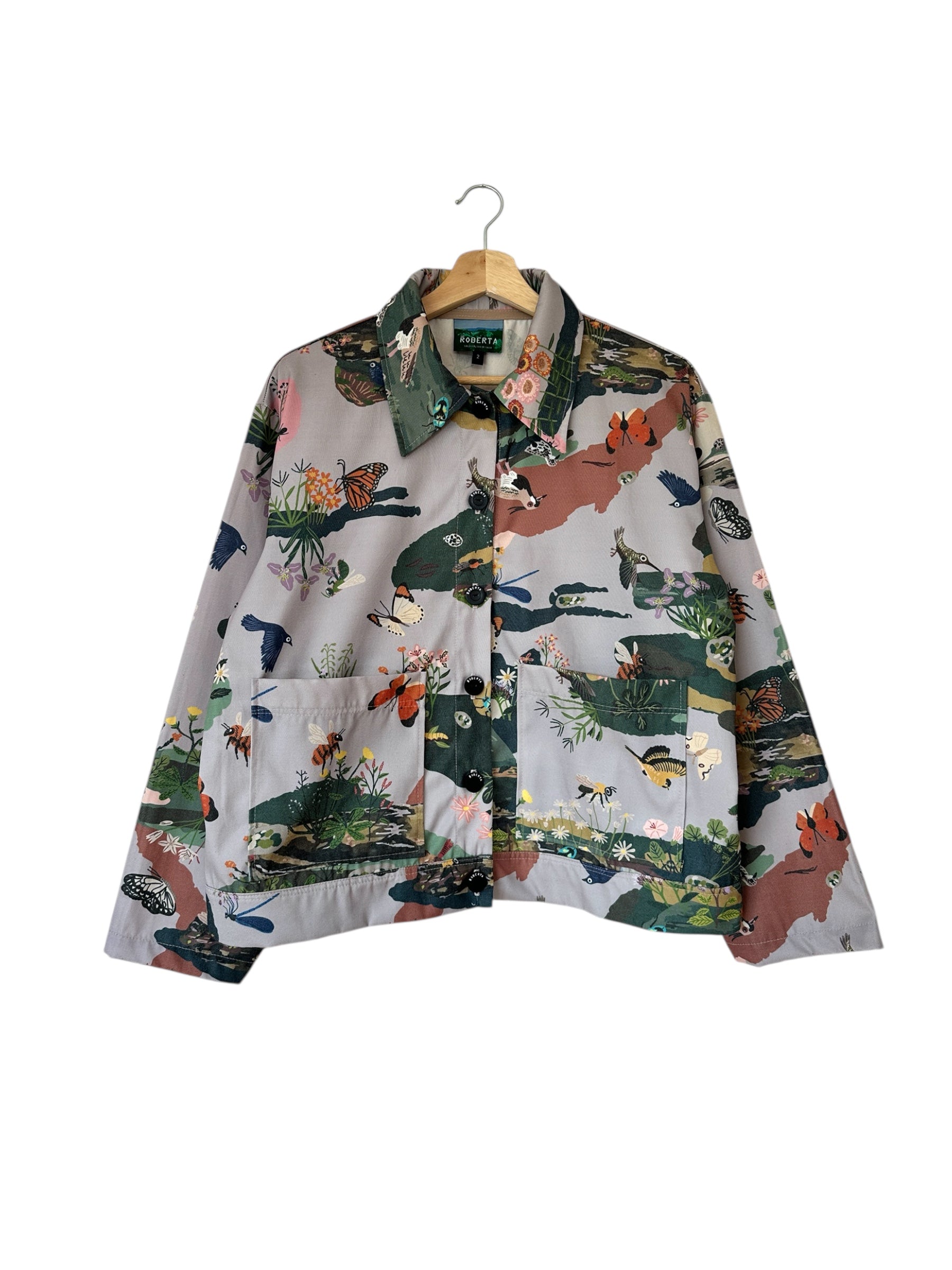 Chaqueta de verano en gabardina liviana y suave. Calce holgado, largo a cadera y con puño incluido.