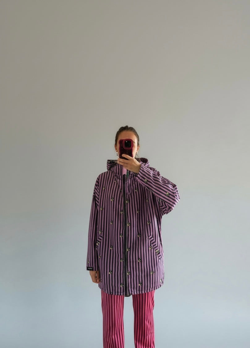 Chaqueta reversible con gorro en tela antifluido repelente al agua y corta viento. Exquisito calce y cierre hasta arriba que cubre bien el cuello y permite que el gorro no se caiga con el viento.