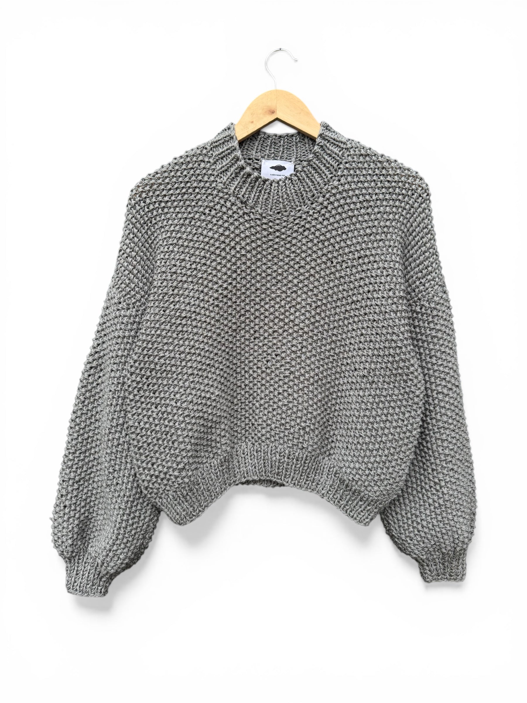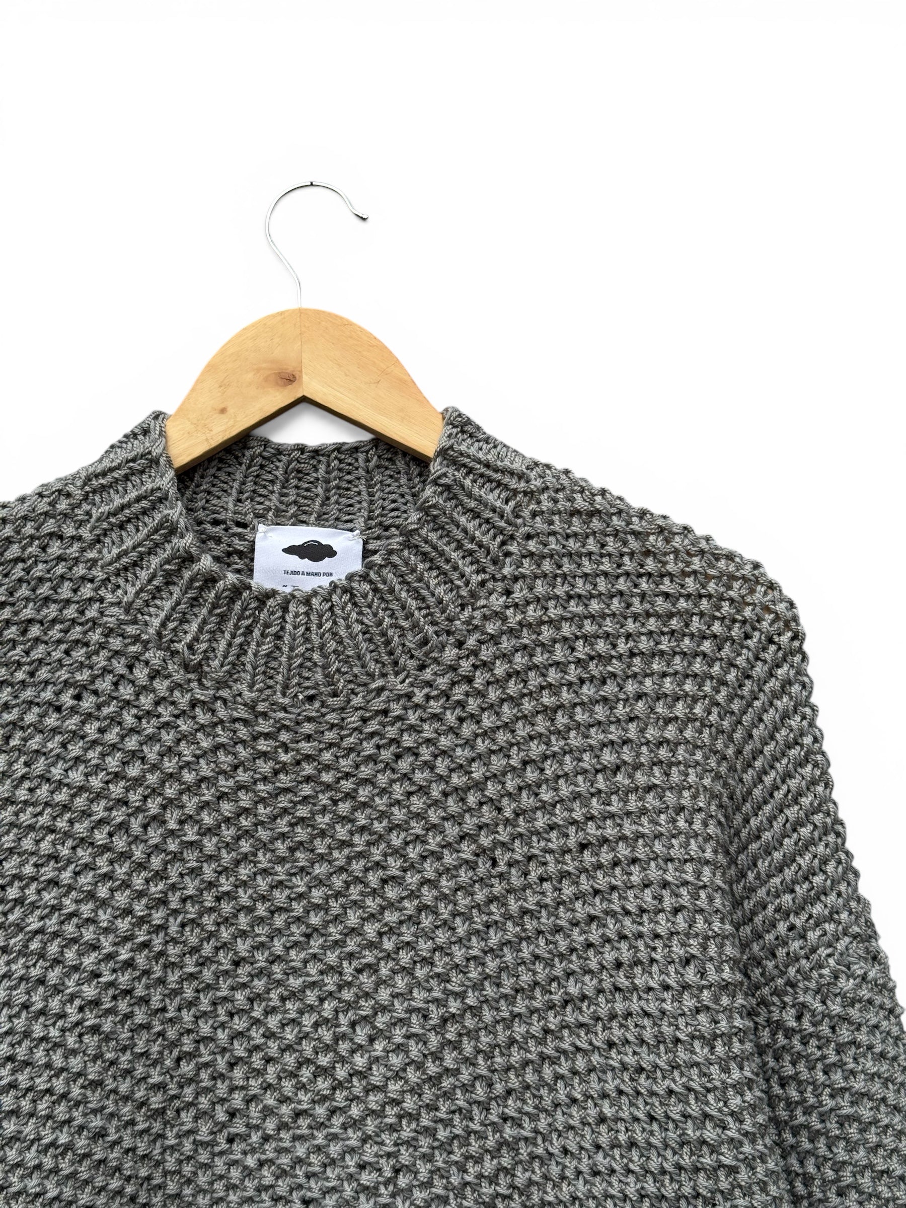 Sweater tejido a mano en Valdivia, sur de Chile. Cuello redondo, calce holgado y relajado, largo hasta cadera alta.