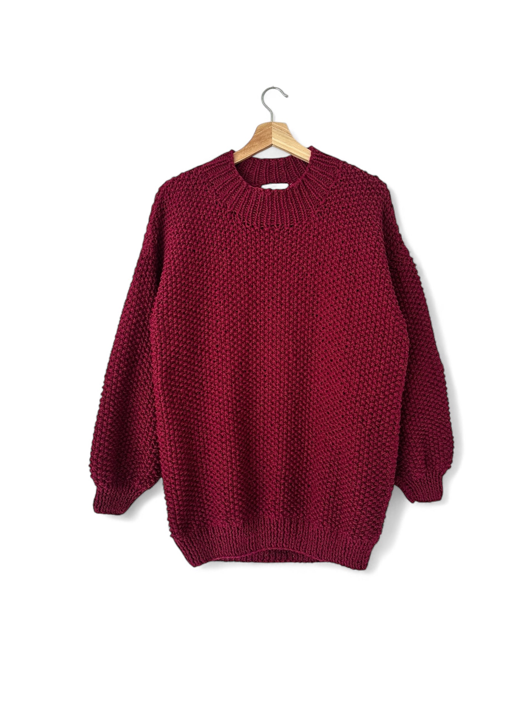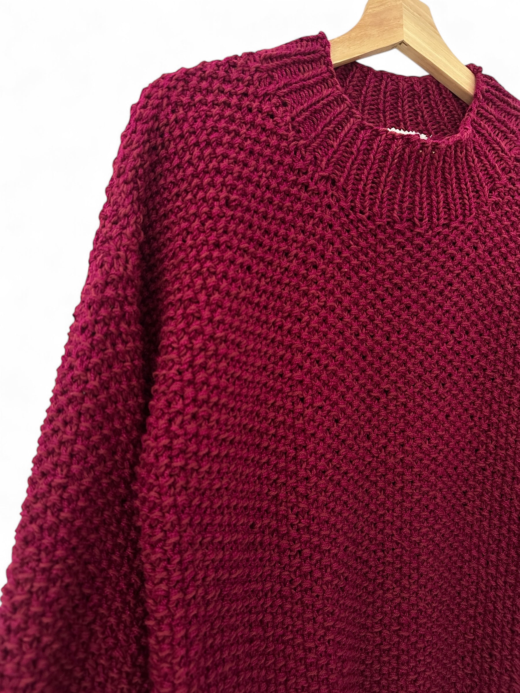 Sweater tejido a mano en Valdivia, sur de Chile. Cuello redondo, calce holgado y relajado, largo bajo caderas.