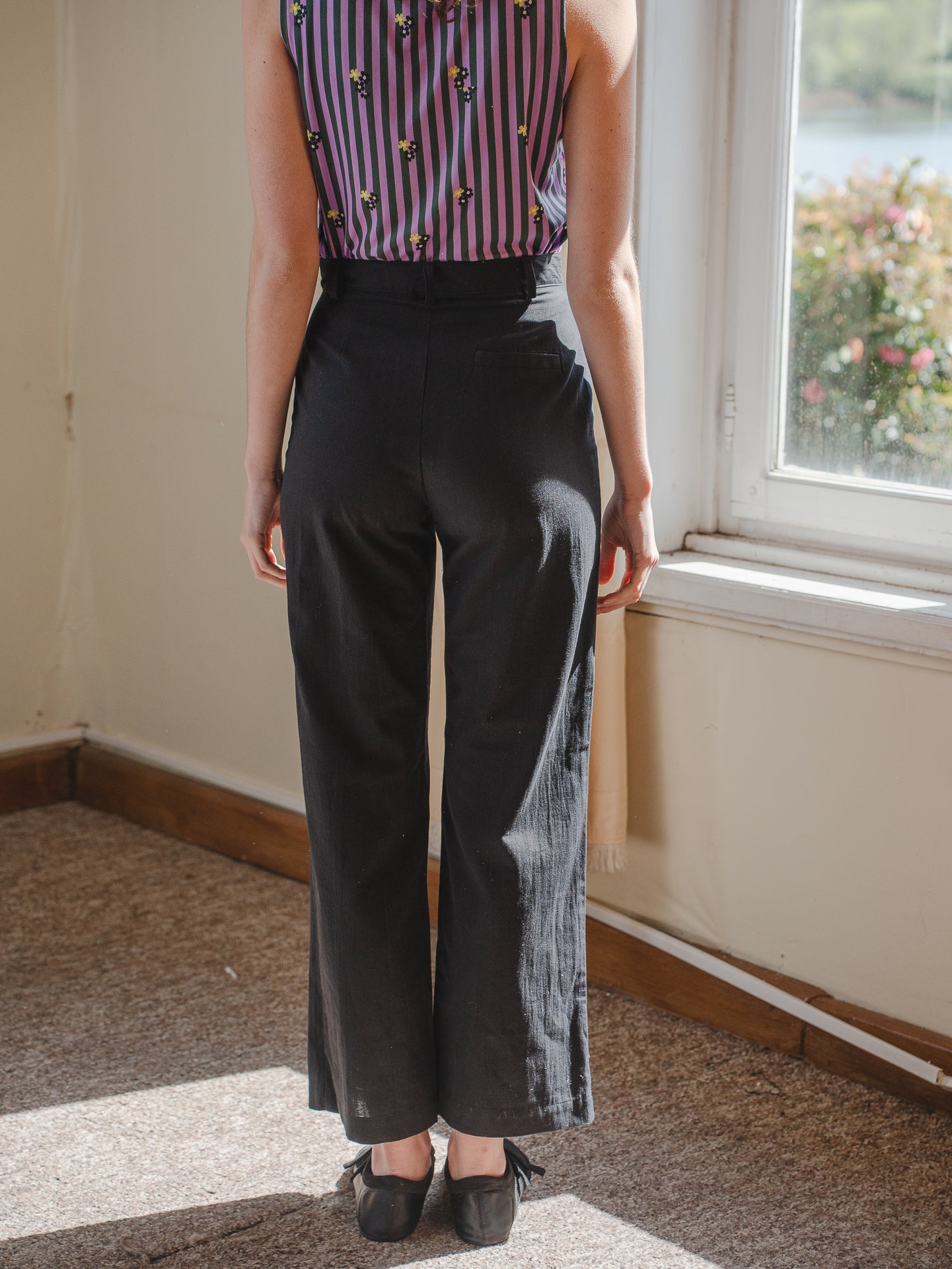 Pantalón tiro alto con cierre y botón en delantero. Bolsillos de ojal.