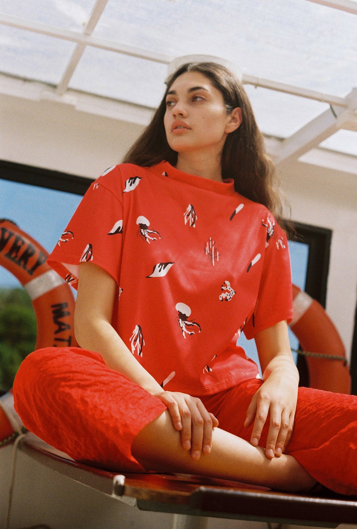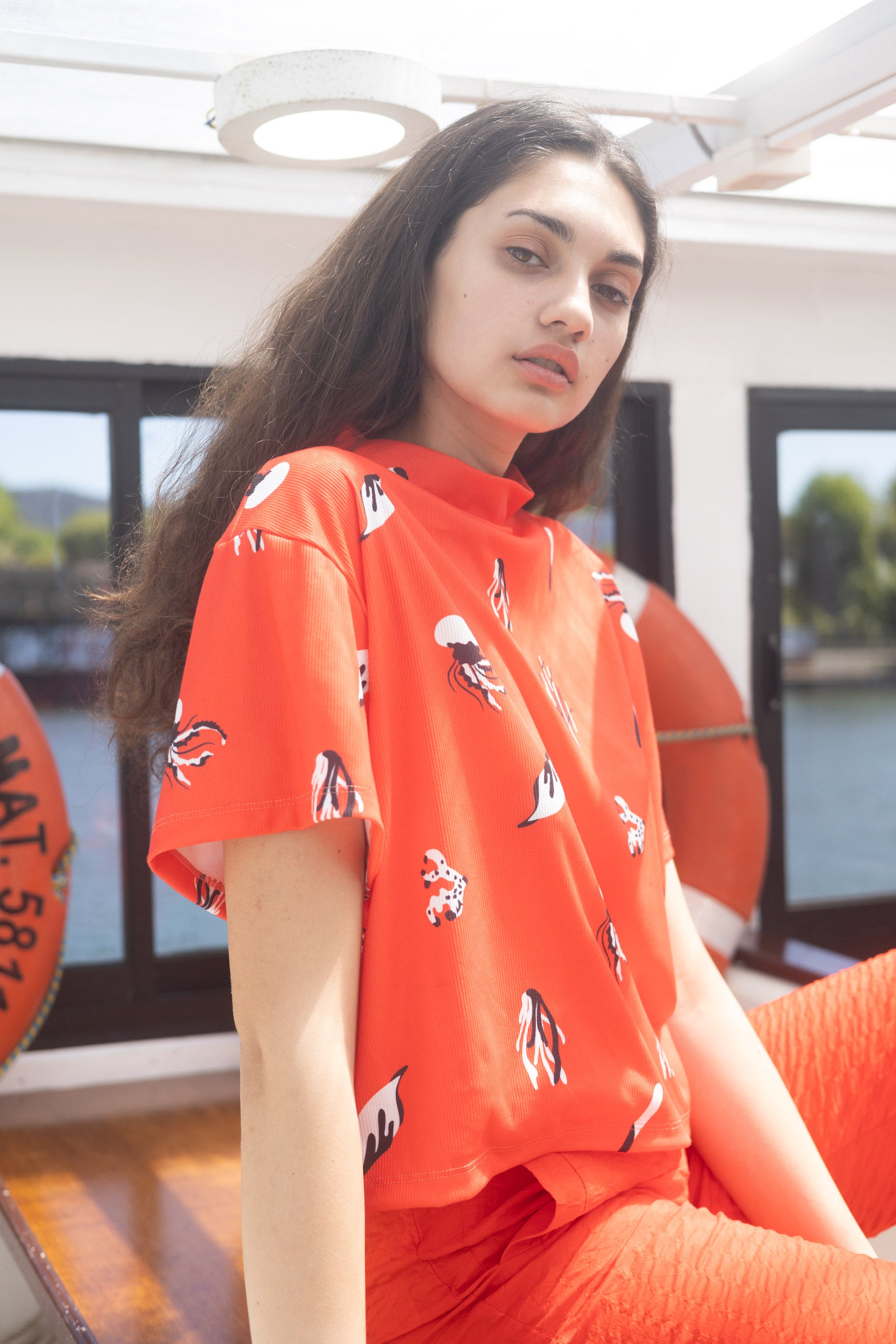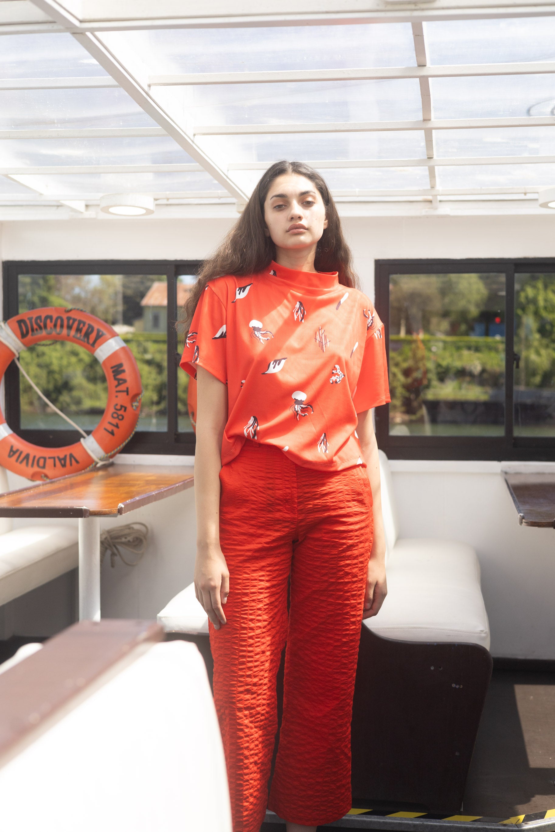 Polera cuello tortuga relajado, manga caída y calce holgado. Fresca y liviana