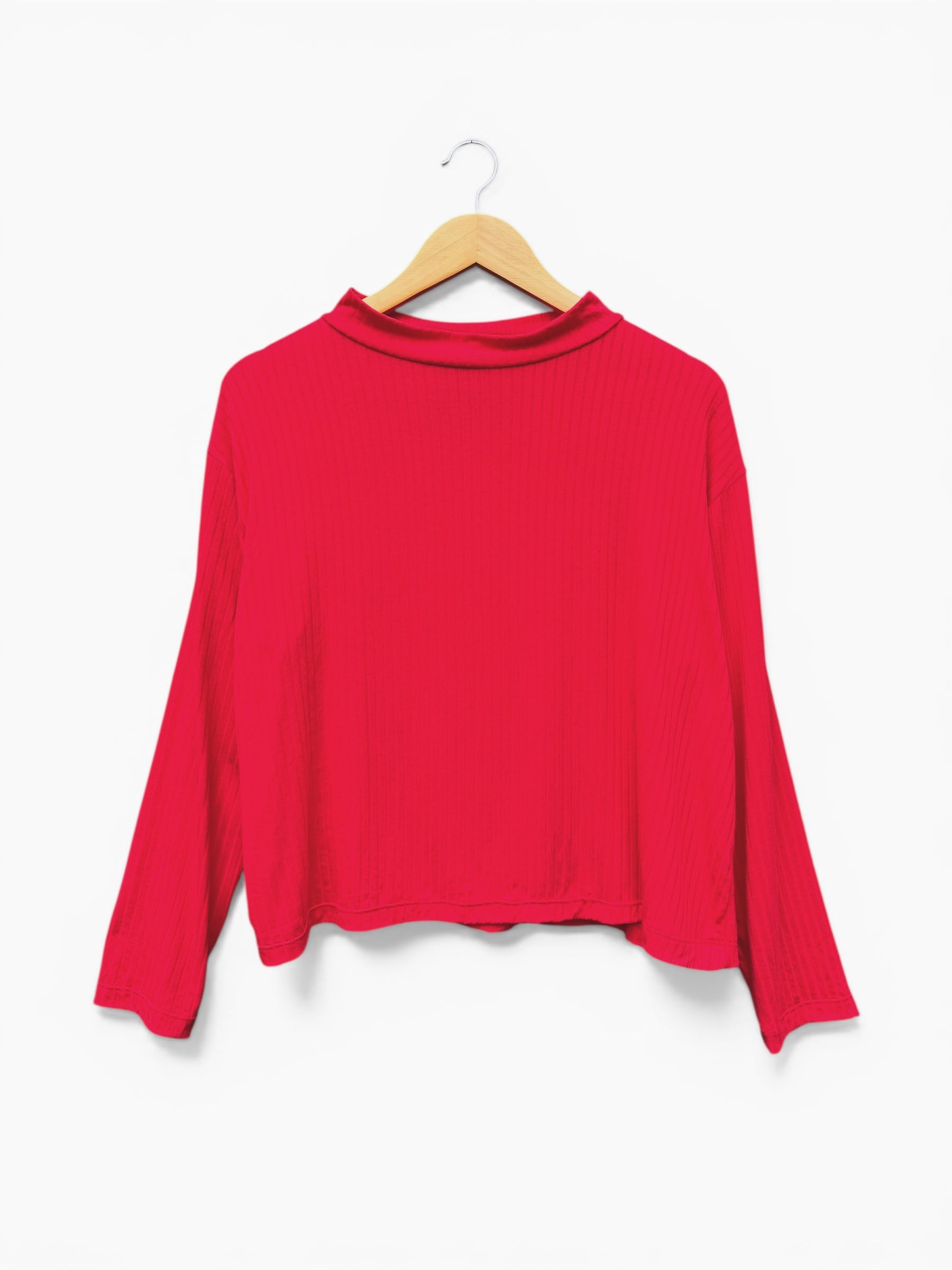 Polera cuello tortuga relajado, manga larga, hombro caído y calce holgado. Tela canutón elasticado grosor medio. Talla única útil desde S a XL.
