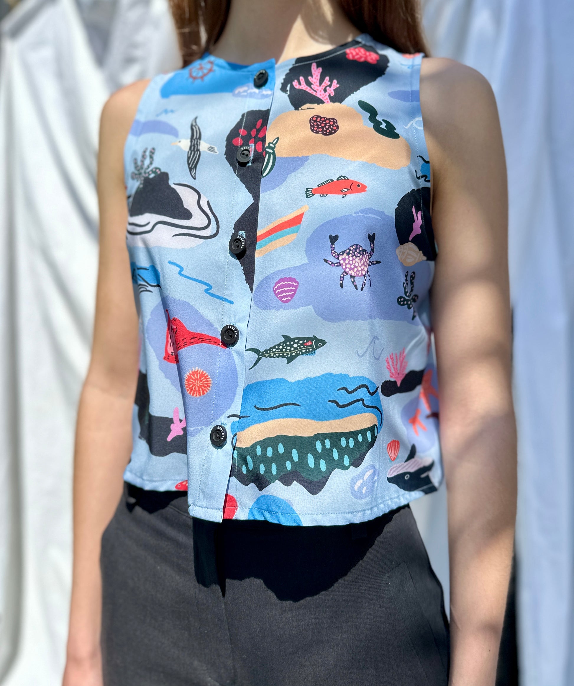 Top sin mangas cuello redondo con abotonadura en delantero.