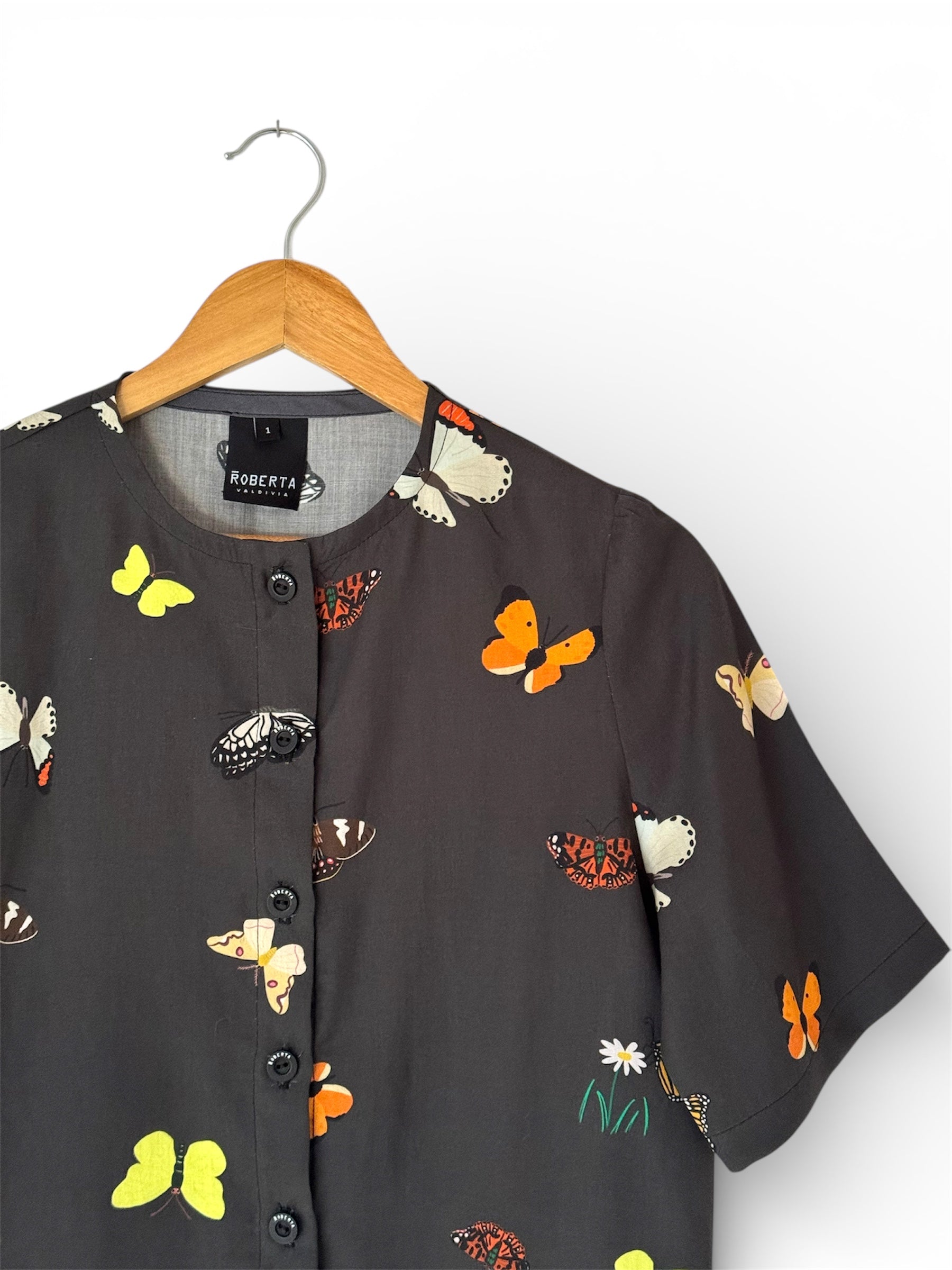 Top manga corta, cuello redondo. Abotonadura en delantero. Calce holgado.