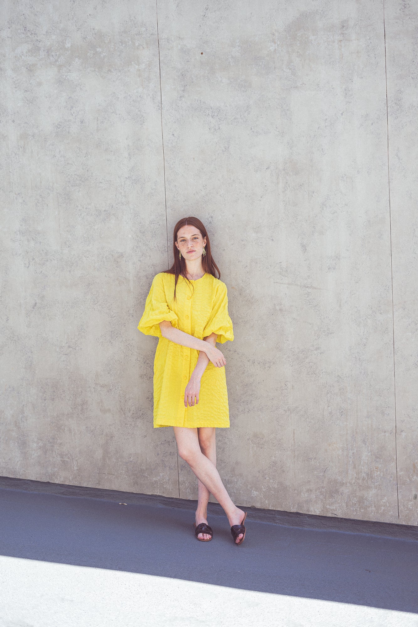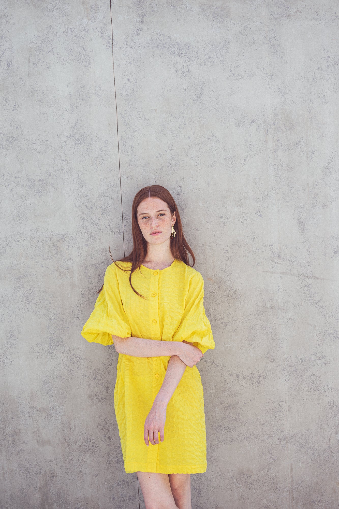 Vestido escote redondo, abotonadura en delantero, manga 3/4 globo, largo sobre rodilla.